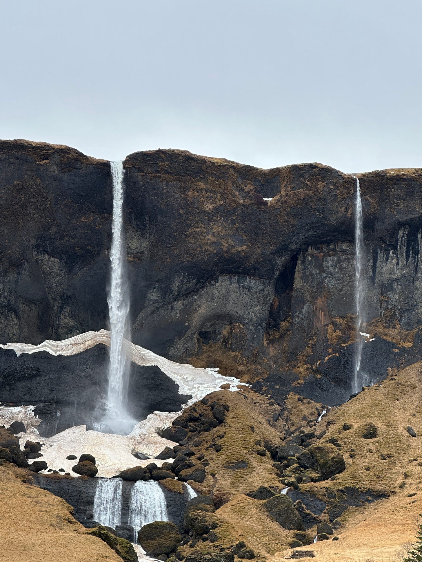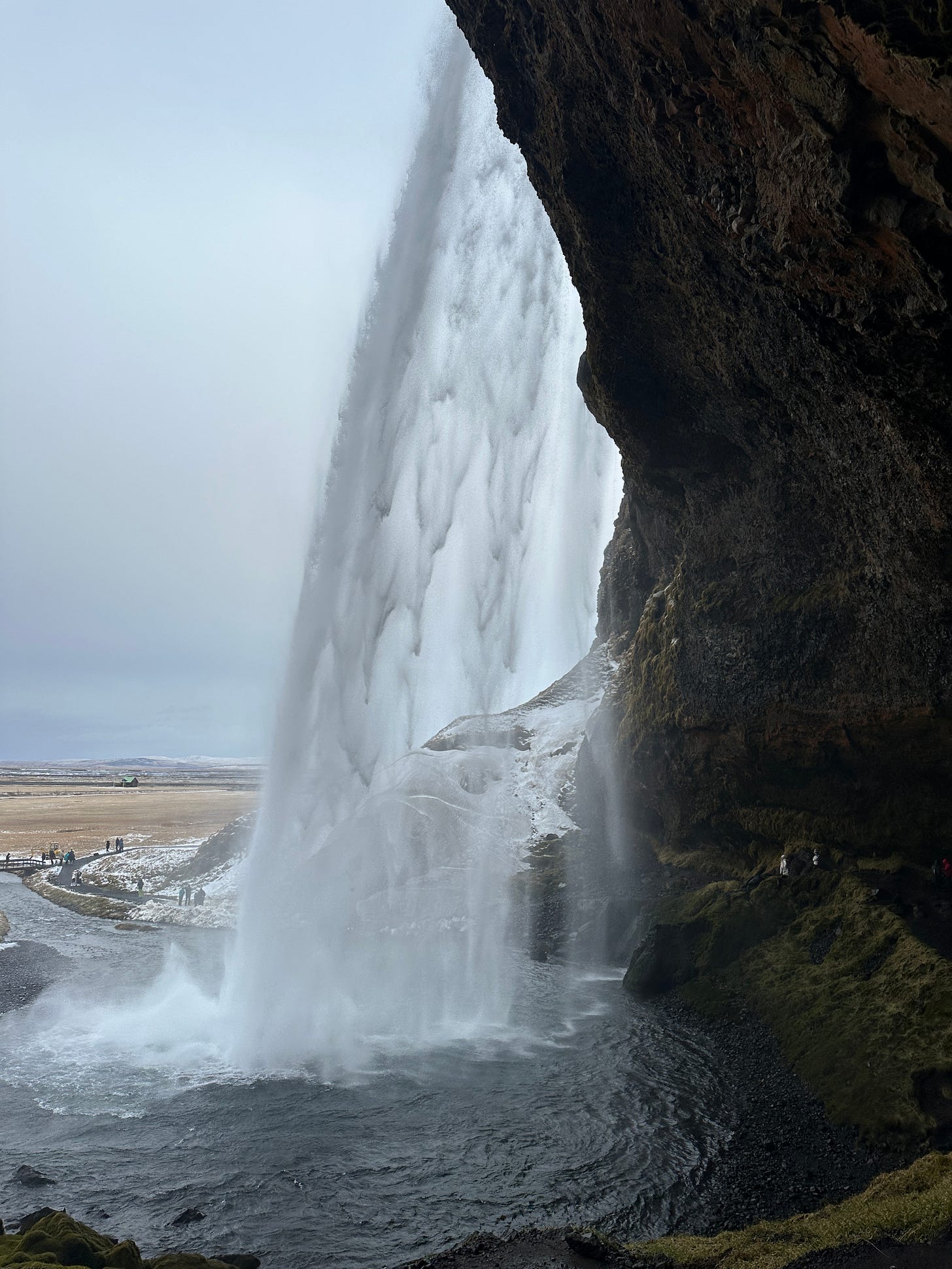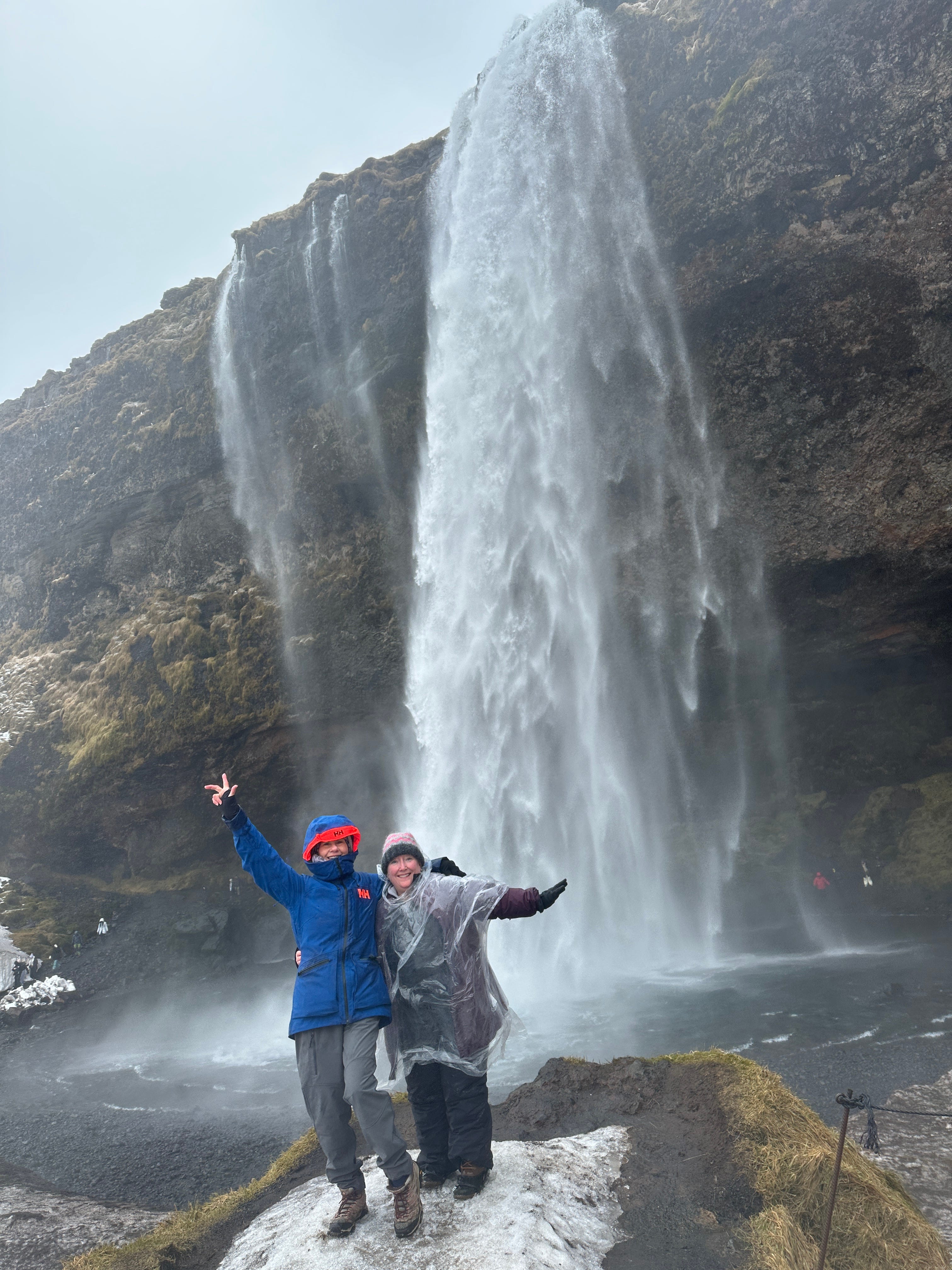 The best thing about this foss is that you can walk behind through a cave area. Wear crampons or spikes and plan on getting wet. It was a bit treacherous boulder climbing briefly on the path with the snow, rain, and wind wearing thick ski clothes, but I think the view from behind was worth it!