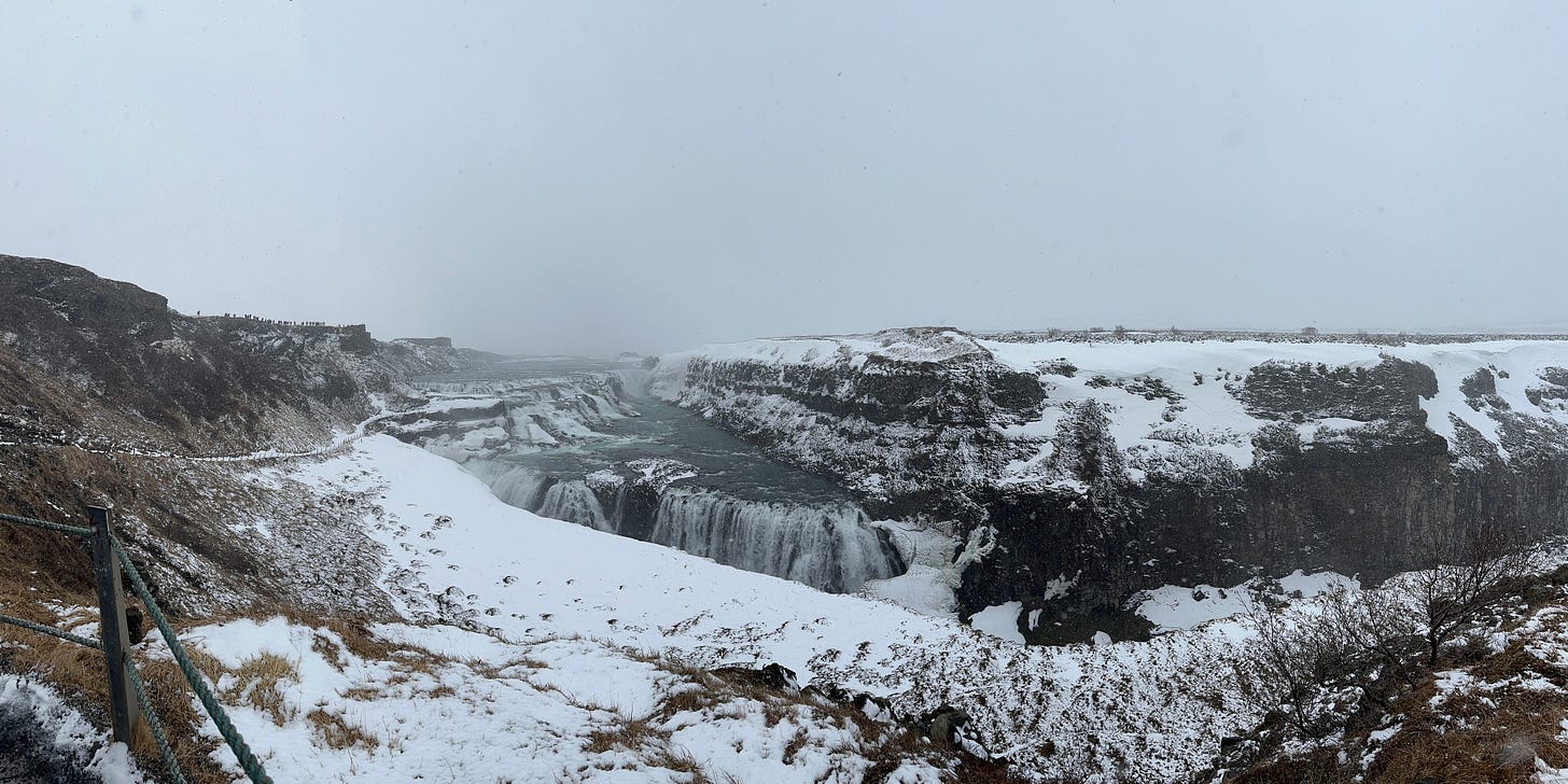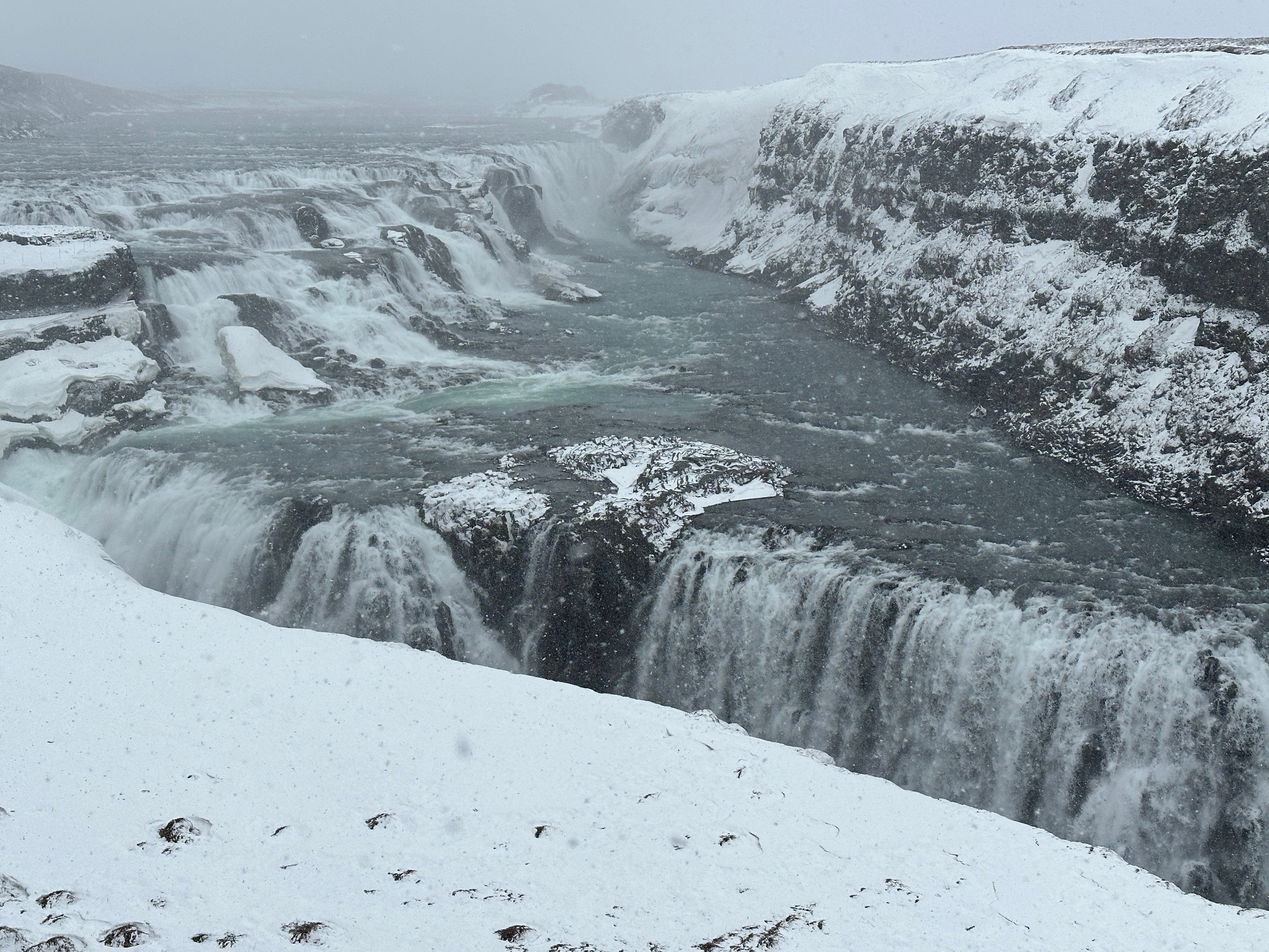 The “Golden Circle” is a popular route which creates a circular trip starting and ending in the capital of Reykjavik. Gullfoss is a major stop on this route. “Gull” translates to “Golden”, and “Foss” translates to waterfall. It was not very golden when I was there. I am not sure the actual definition of blizzard conditions, but that is what it felt like. High on the bluffs, with the wind, sleet and snow beating down, it was actually hard to concentrate on the amazing sight. Gullfoss has to be viewed from several trails (paved, stairs) from the top. There is a lower trail (still above the falls) that appears to be more natural, but that is only open in the summer.