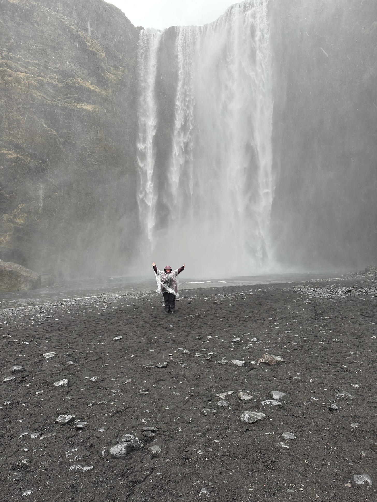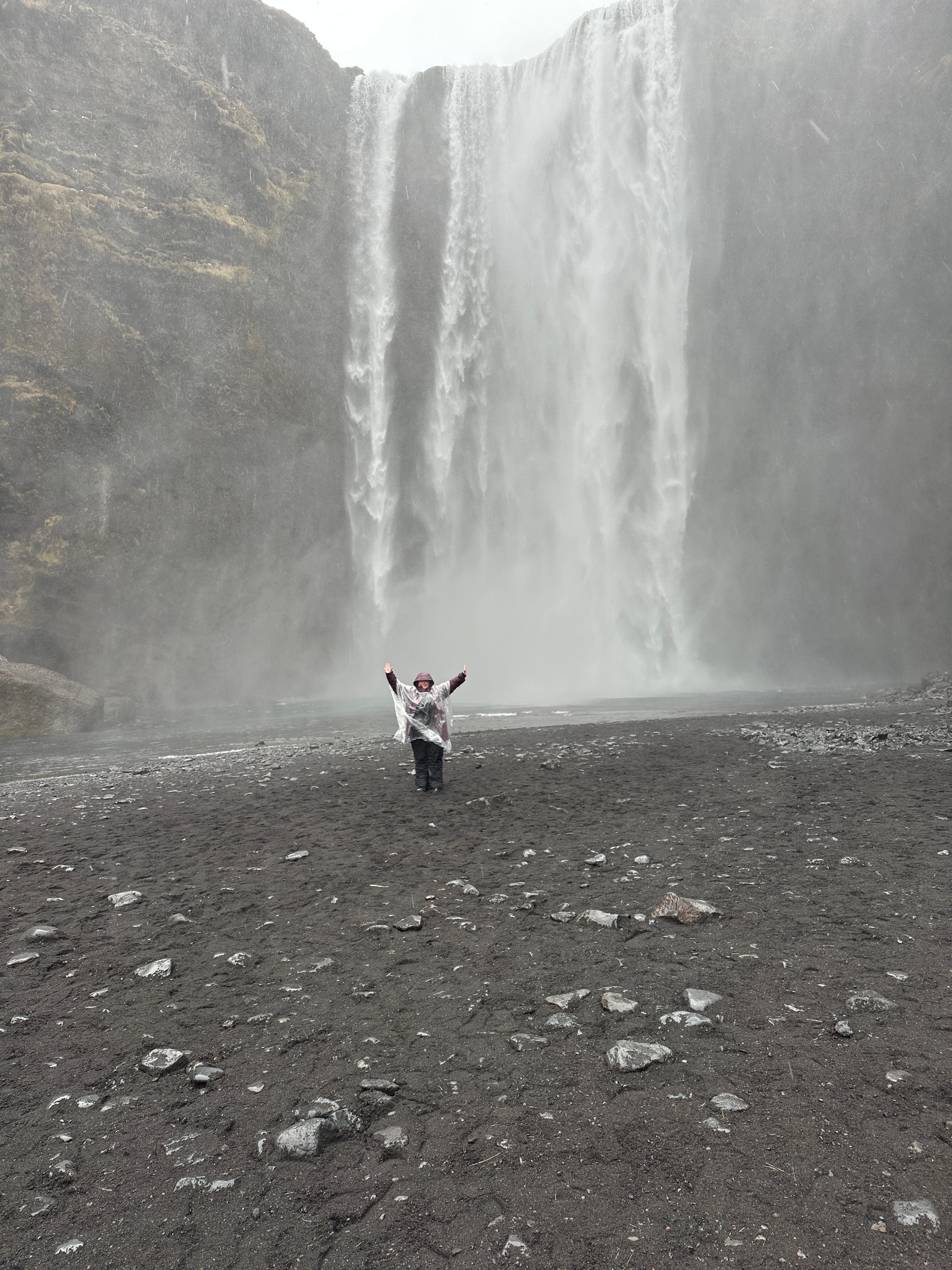 Next up was my very favorite, the mighty Skogafoss. It is one of the largest waterfalls in the country, at 82 feet wide and a plunge of 200 feet. If you are feeling spunky, you can take the 500 metal steps to the top of this one. I was fine to appreciate this one from the bottom, given the weather. Translating the name would give you “Forest Waterfall”, but there are not a lot of trees around (or in general in Iceland).